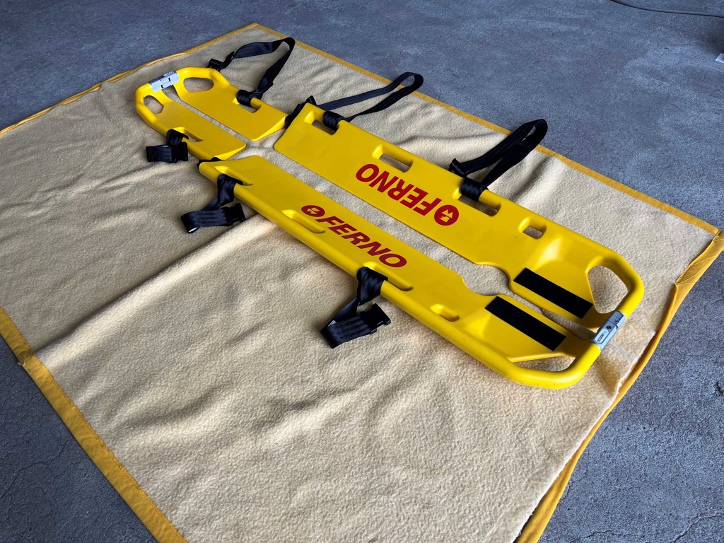 2つに割り傷病者を動かすことなくすくい収容できることが一番の特徴です。脊髄損傷を疑うなどの安静に搬送したい傷病者や大腿骨頸部骨折等の体動により強い痛みを訴える傷病者に対し最小限の動きで収容することができます。また、傷病者の体型に合わせ長さ調節が可能です。
