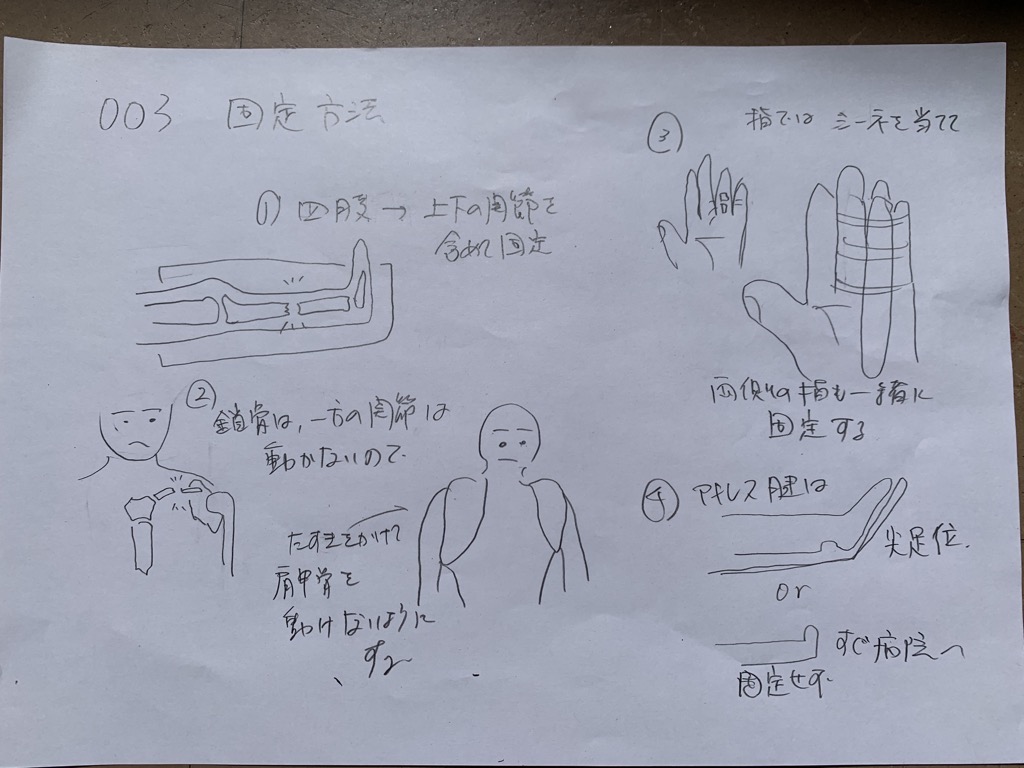 固定の原則は、骨折部が動かないように上下の関節を含めることです。ただ学校にはそこまでの要求はしませんので、骨折部が動かないようにすれば大丈夫です。