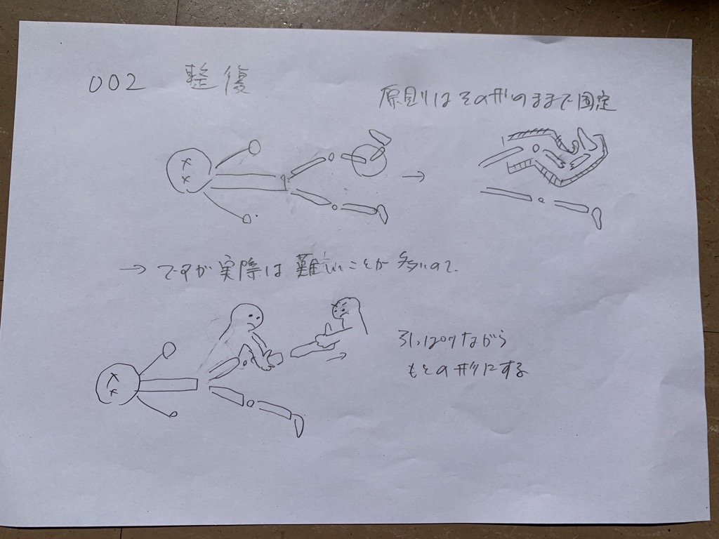 ただ、曲がっているそのままを固定するのは難しいことがあります。その場合は骨折部の体幹側を別の人に持ってもらい、末梢側を引きながら元の形に戻します。