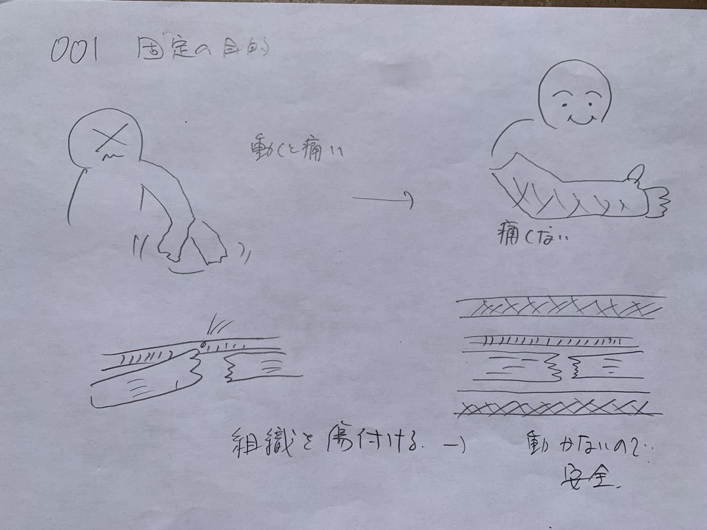 骨の表面には骨膜があり、ここに知覚神経が分布しています。骨折により骨膜が裂けることで痛みを感じます。骨の周りには脂肪など組織がありますので、骨折部分が動くと周りに擦れてさらに痛みが増します。骨折部が動かなければ、少なくとも擦れる痛みはなくなります。