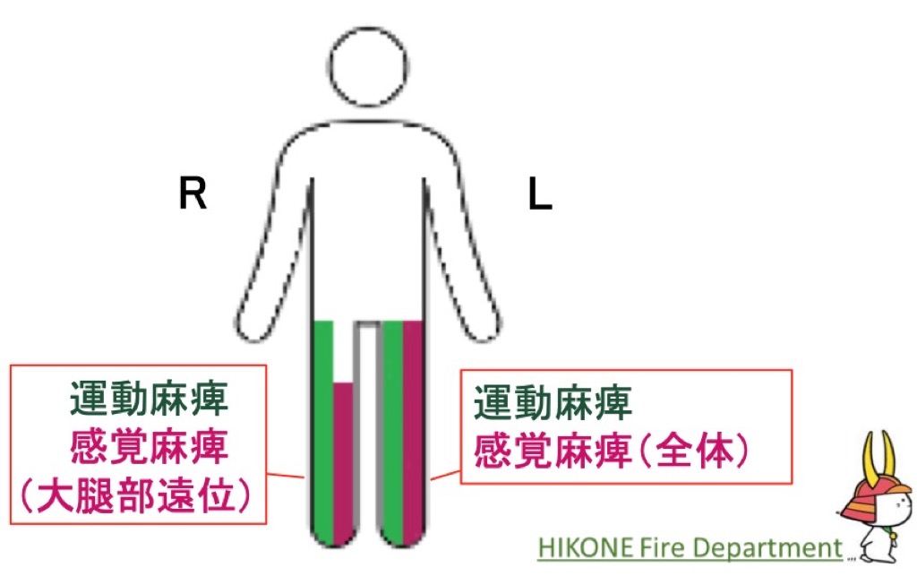 主訴は両下肢の脱力のみで(004)、救急隊接触時に呂律困難は改善されていた(005)。麻痺所見は、両下肢の運動麻痺、右下肢大腿部遠位の感覚麻痺、左下肢全体の感覚麻痺であった(006)。