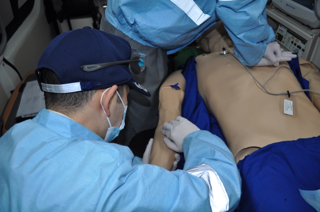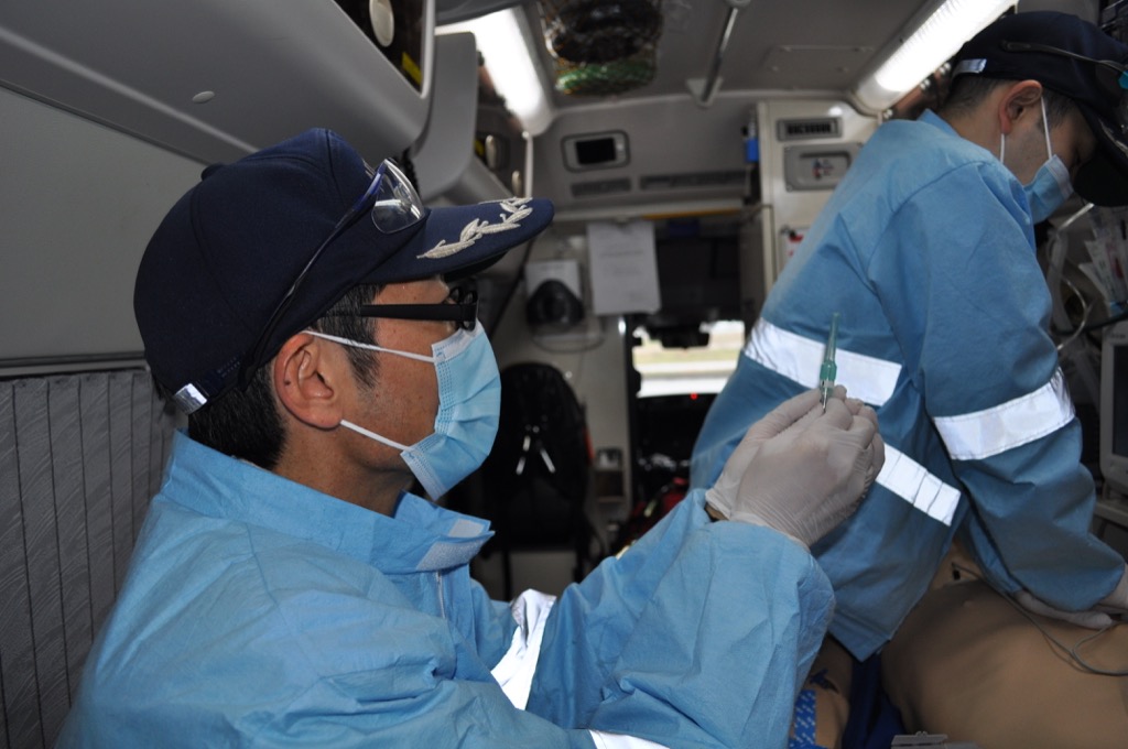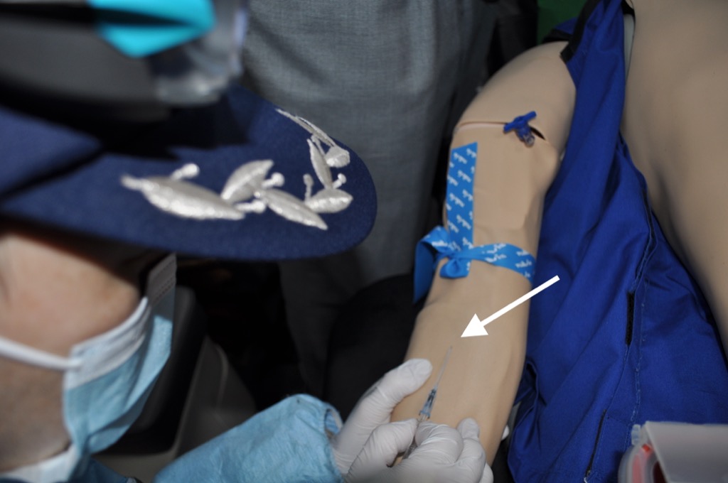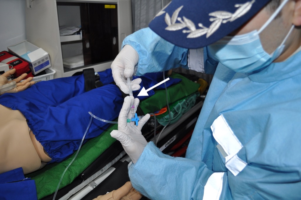 傷病者の右側の穿刺血管を検索するとともに、右側穿刺に向けて隊員と資器材を配置する。