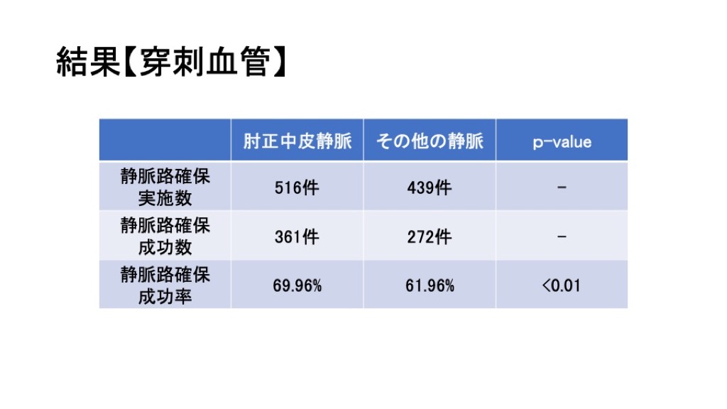 穿刺血管の肘正中皮静脈、穿刺側の右側、穿刺回数の1回目で静脈路確保成功率が高く、有意差を認めました。
