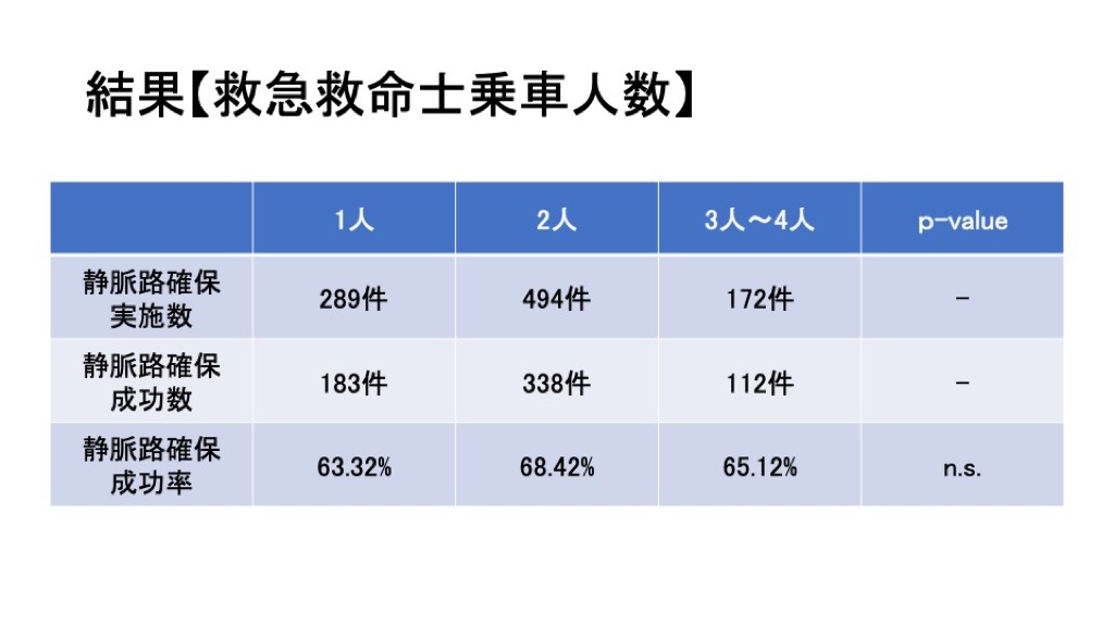 また有意差は認められなかったものの、救急救命士乗車人数は1人より2人以上で静脈路確保成功率が上昇していました。