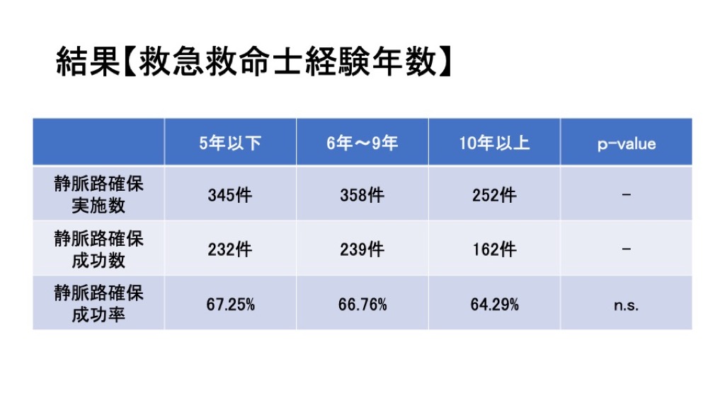 救急救命士経験年数別での静脈路確保成功率は、5年以下が67.25%、6年から9年が66.76%、10年以上が64.29%で有意差は認めませんでした(003)。