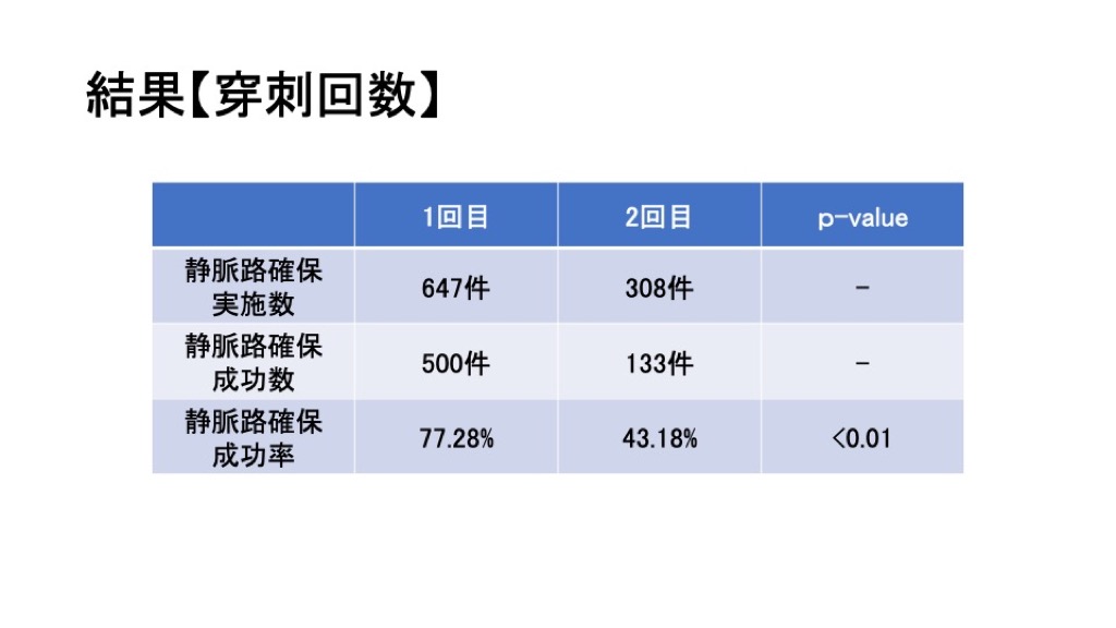 穿刺回数別での静脈路確保成功率は、1回目が77.28%、2回目が43.18%で有意差を認めました(006)。