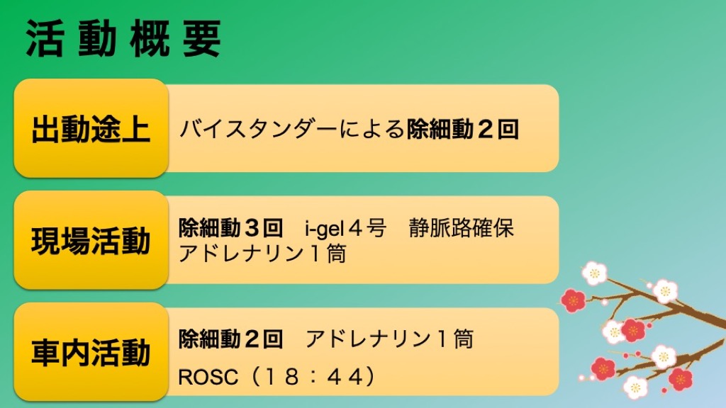 18:44、発症から約29分後に搬送途上で自己心拍及び呼吸が再開し、病院収容まで継続した。
