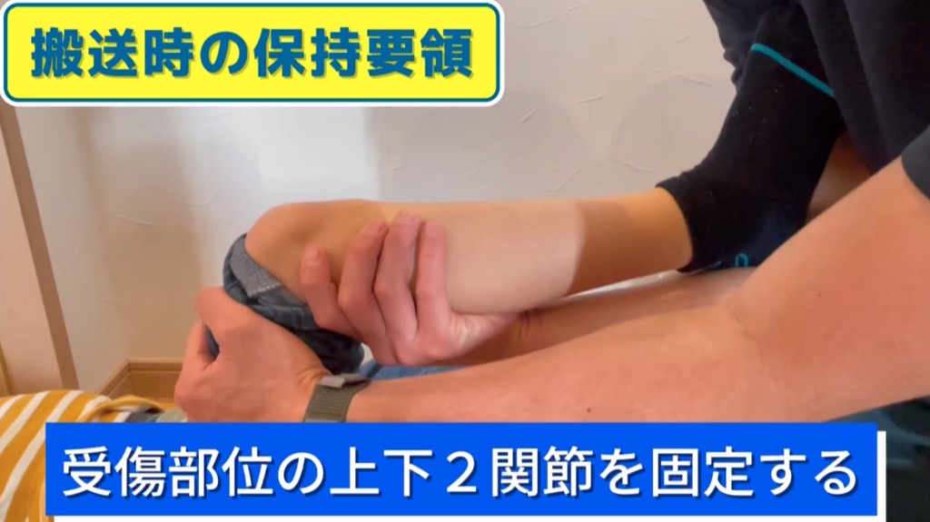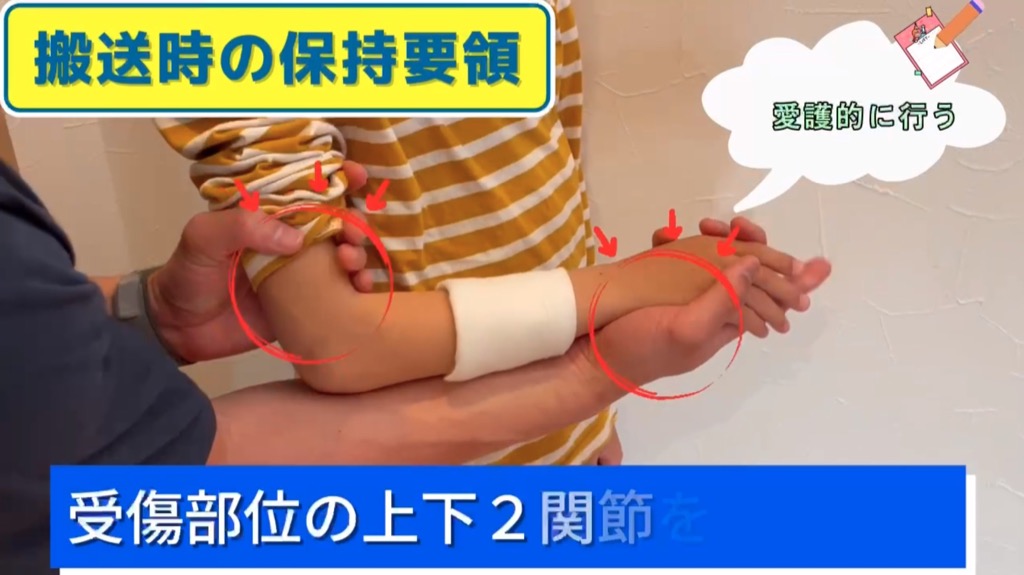 骨折部を動かさないように搬送します。患児が動けない場合には多人数で抱えて移動させます。