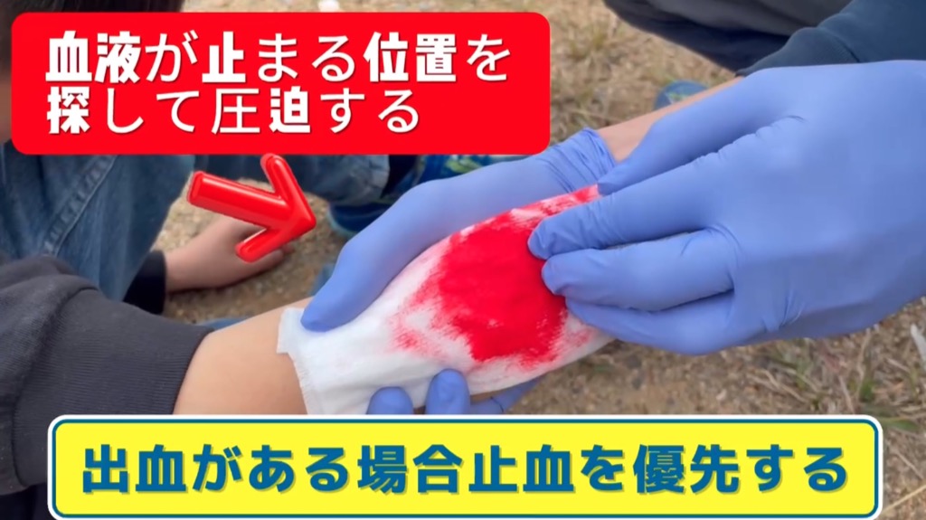 (2)救急車が早く到着できるようなら、現場で手で維持して救急車を待つのも良いでしょう