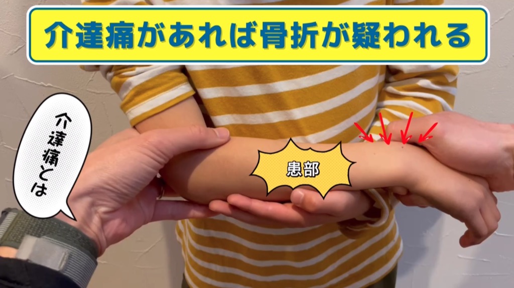 骨折しているかどうかの見分け方です。簡単なのが「介達痛」の確認です。骨折していると思われる場所から少し離れた場所を押すと骨折部を痛がるというものです。