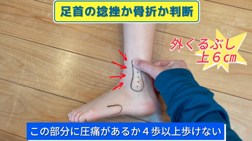 捻挫の場合はくるぶしから離れた場所を押すと、骨折では折れているところを痛がり、捻挫では痛みがありません。ただこの「介達痛」は骨折の目安にはなりますが、あったからすぐ骨折でもないし、なかったから大丈夫ともならないところが辛いところです。