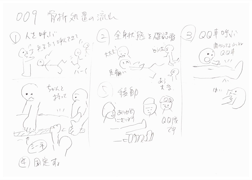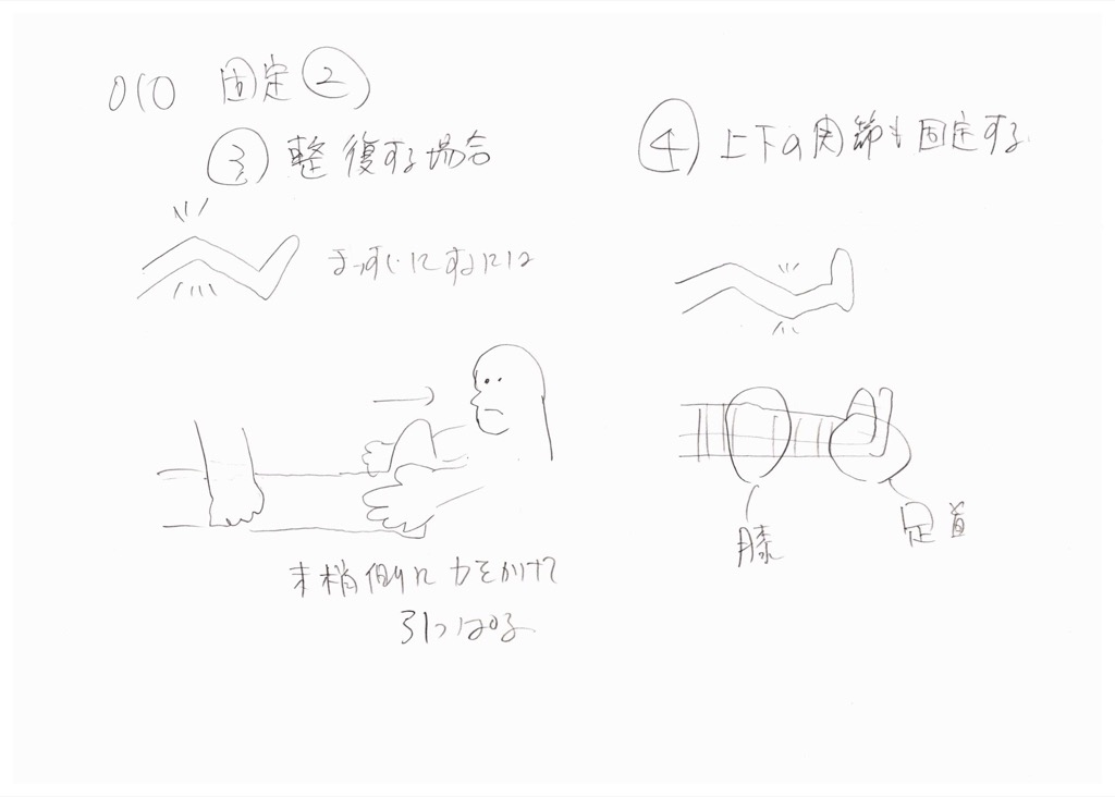 今の状態を悪化させない固定を目指します。つまり、骨折部が動くことなく患児に苦痛を与えない固定です。病院で行うような完璧な固定は不要です。