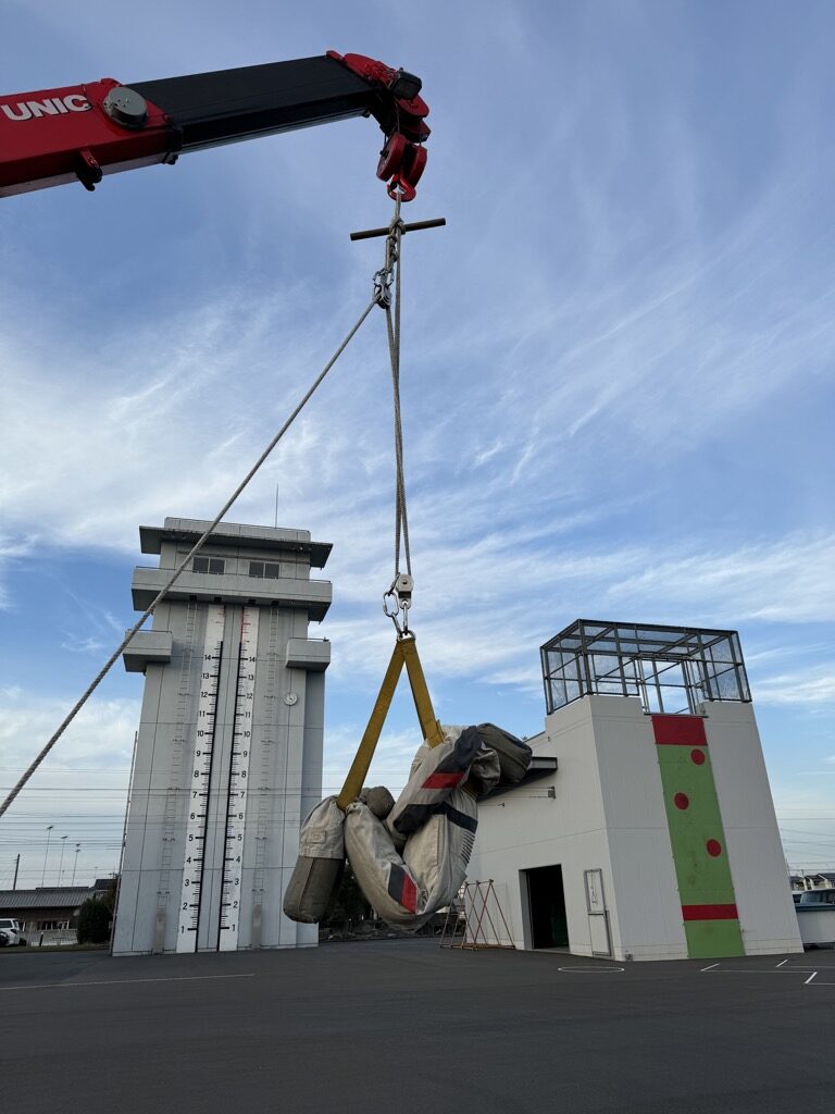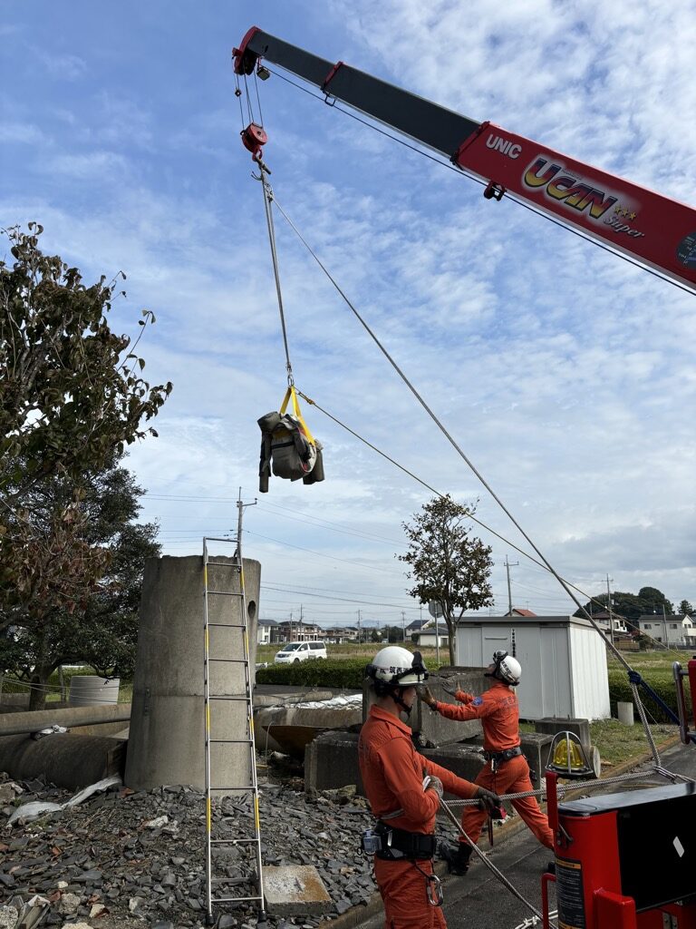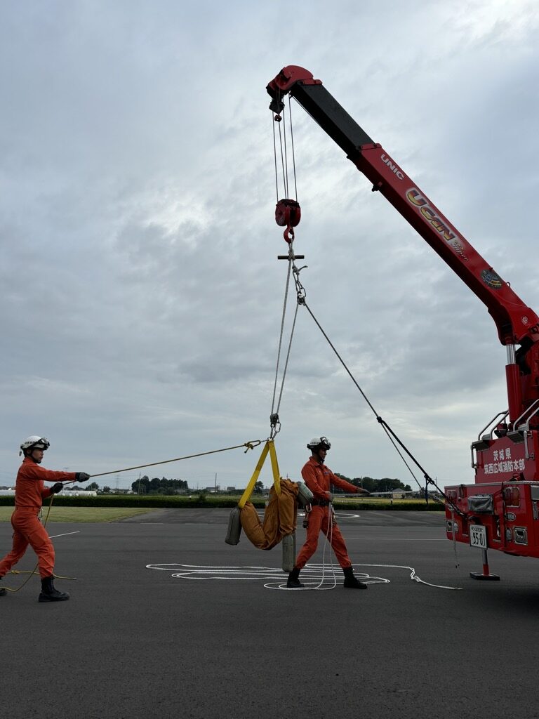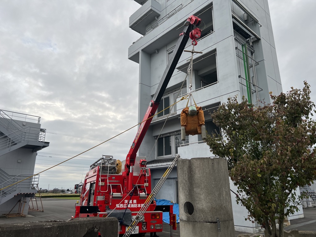 上記の通り法令解釈によると要救助者は労働者に該当しないため、移動式クレーンによる吊り上げ及び運搬が可能ではあるが、当消防本部ではフックの回転部で巻き込み危険及びフックの巻き下げ限界があることから、フックは救出用の支点とし、救出システムの使用中はクレーン動作を行わないこととしています。
