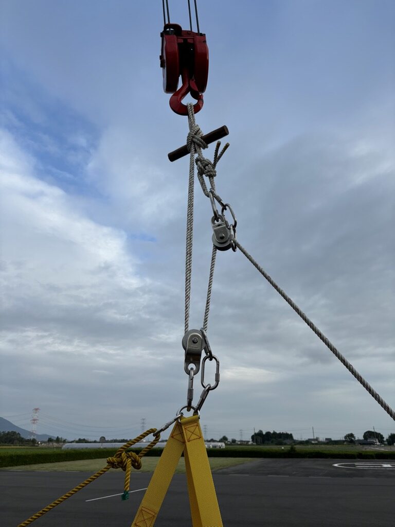 誘導ロープを設定せずに要救助者を上げた場合、要救助者が回転してシステムが捻れてしまうので注意