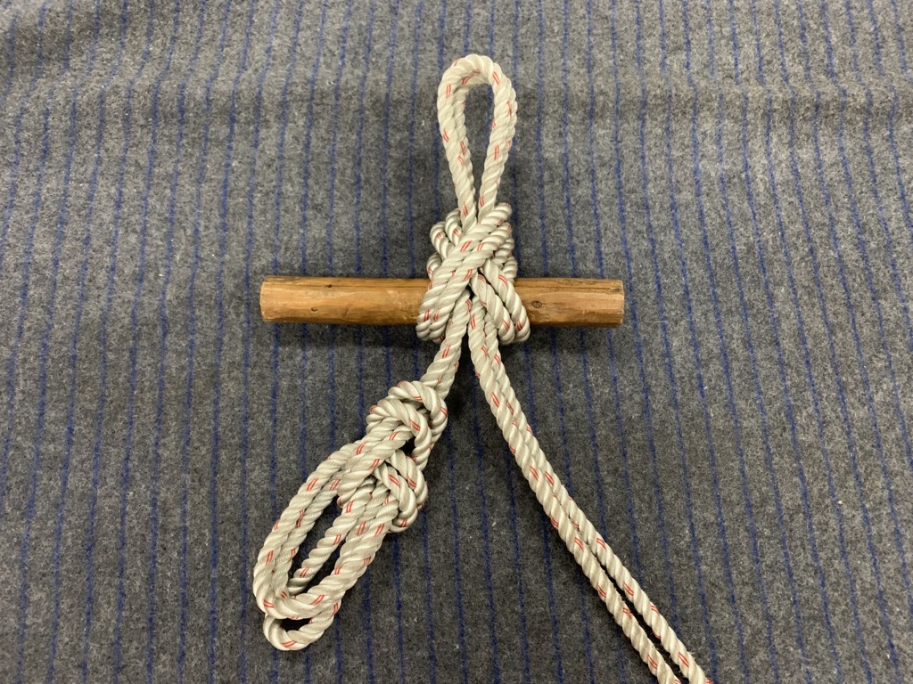 蝶結びはロープが撚れないよう作成し、トグルが脱落しないようしっかりと締め付ける。