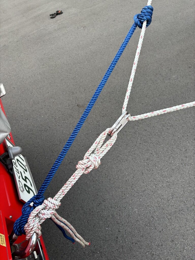 このシステムの特徴として、三つ打ちロープのつるべ式を採用し通常は支点を二か所使用しますが、今回のシステムを使用する場合、支点は一か所のみで設定することができ、システムの搬送や着脱が容易になります。またフック部分は八の字結びでも可能ではありますが、蝶結びは三方向の荷重に耐えられる結びであり、荷重が掛かったあとでも解絡が容易なため採用しています。(写真3参照)