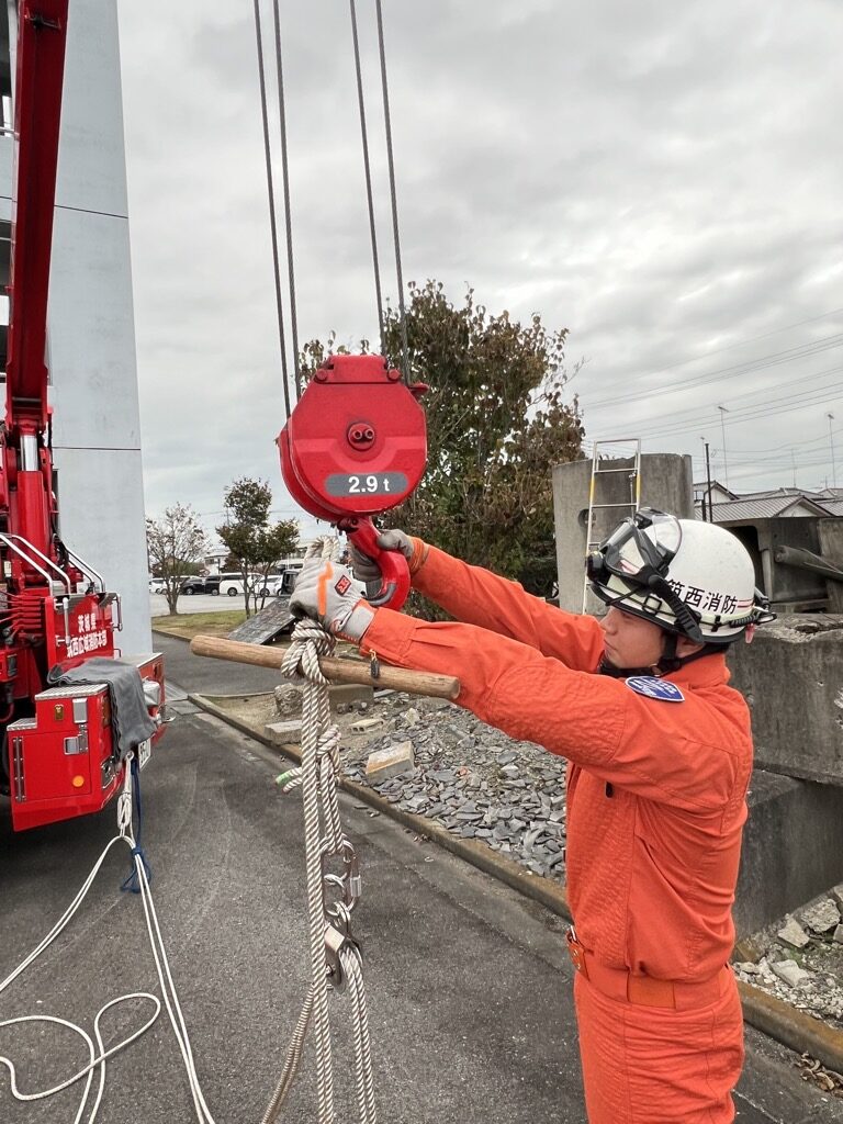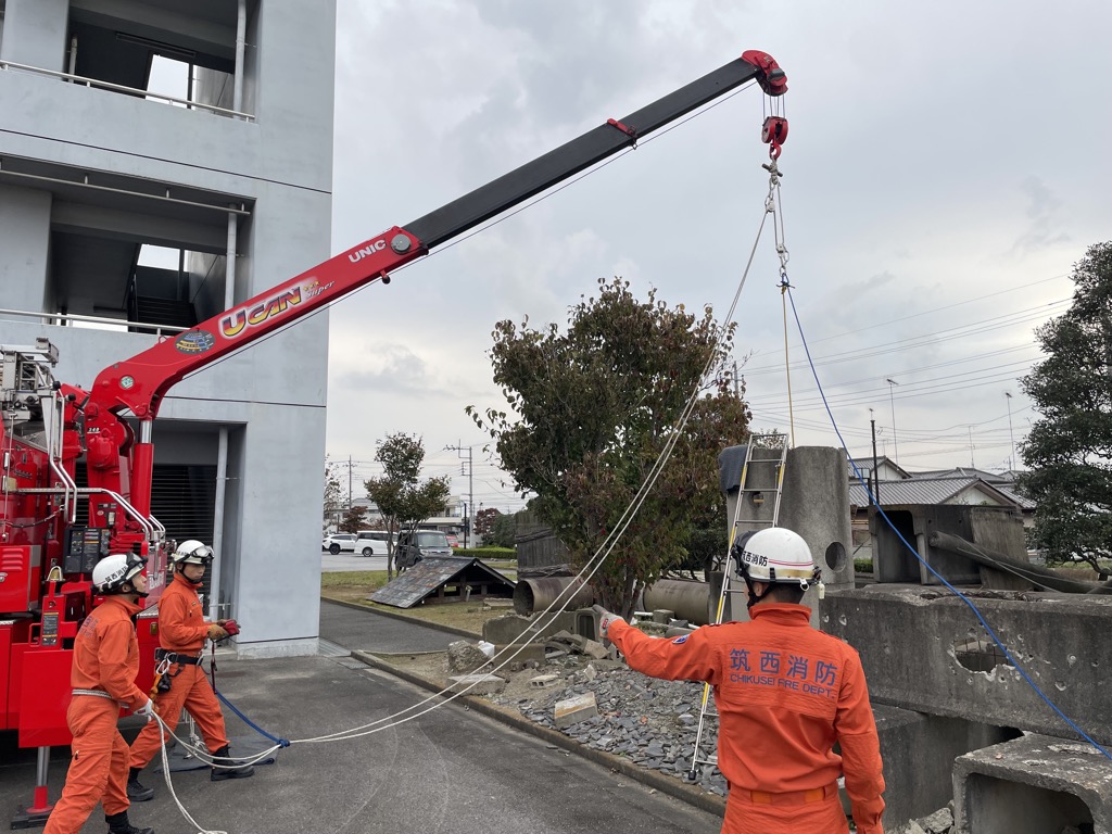 クレーンを設定できる場所は限られますが、災害現場により救出プランの適性を見極め、保有している車両・資器材を有効に活用して迅速で安全な救助活動に繋げて行きます。皆様の参考になれば幸いです。