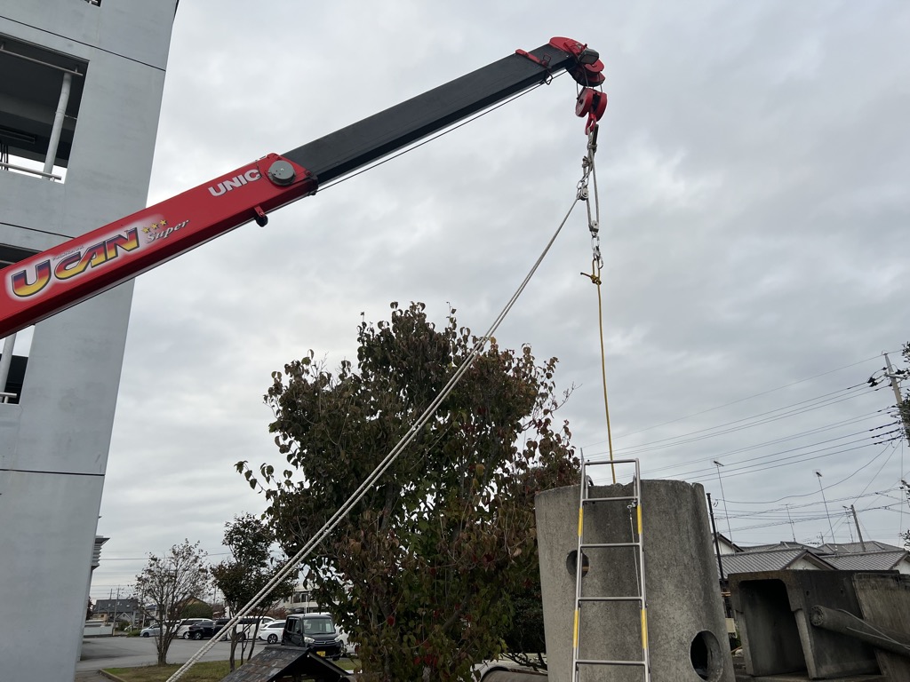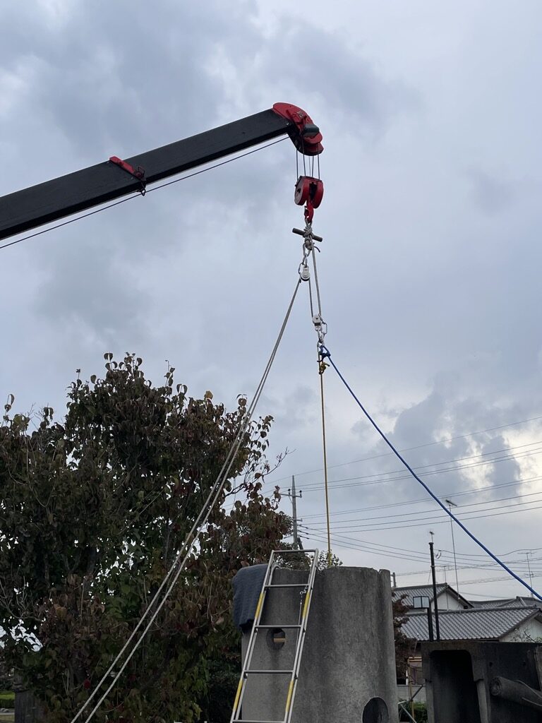上部へ突き出ている立て坑の場合は支点を高く設定することで、誘導が容易になる。