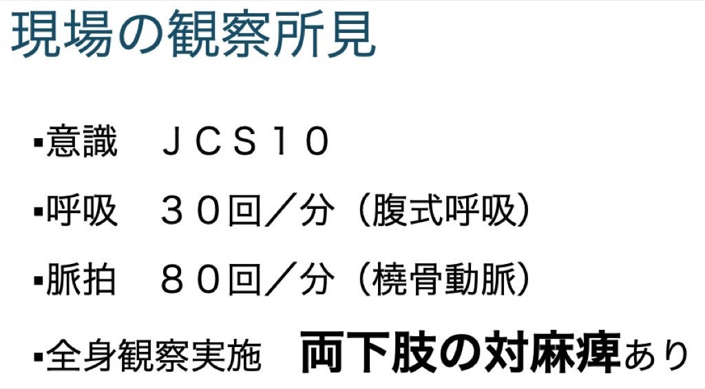 脊髄損傷では麻痺した部分の交感神経が遮断され副交感神経優位になるため、血圧が低下する。本症例では血圧は104/78mmHgと保たれているが、呼吸が腹式呼吸であったこと、心拍数も徐脈になっていないことから、脊髄損傷としても不全麻痺だったと思われる。しかし患者は医師によりモルヒネ投与と気管挿管をされている。呼吸状態はかなり不安定だったようだ。脊髄損傷では同じ部分を損傷しても出る症状や場所は大きく異なることがあるので「胸椎だから呼吸は大丈夫」ではなく「脊髄損傷ならどの部位の損傷でも心肺蘇生」と考えるようにしよう。
