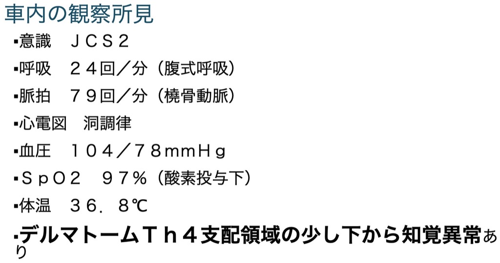 車内での観察所見を表2に示す。デルマトームTh4支配領域の少し下から知覚異常を認めた。