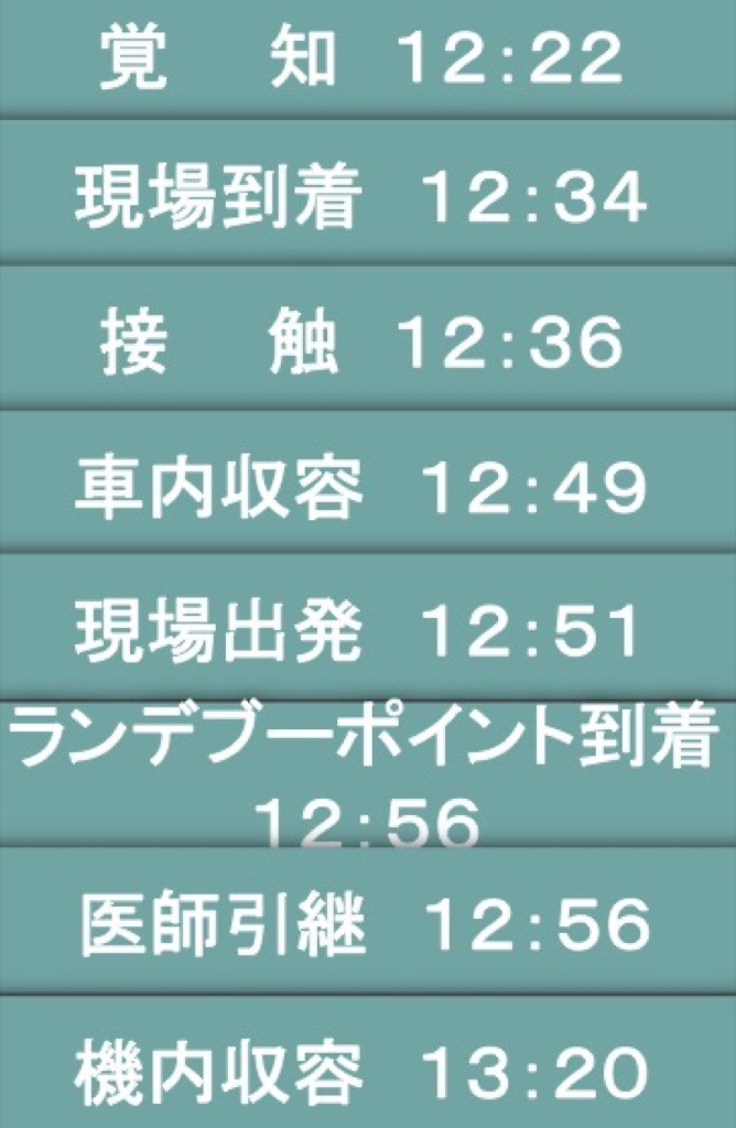 ランデブーポイントにおいて、医師及び看護師により静脈路確保、モルヒネ投与、ビデオ喉頭鏡を用いた気管挿管が実施された後にドクターヘリに収容、市外の三次医療機関へ搬送された。時間経過を表3に示す。